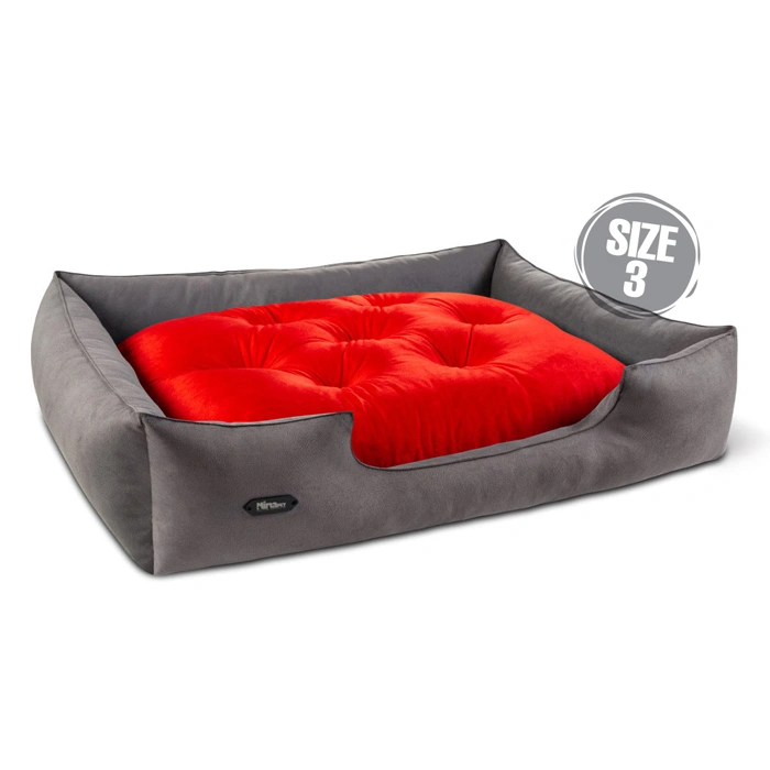 مزایای ویژه جای خواب سگ و گربه جنس پارچه مبلی درجه یک خاکستری با تشک قرمز