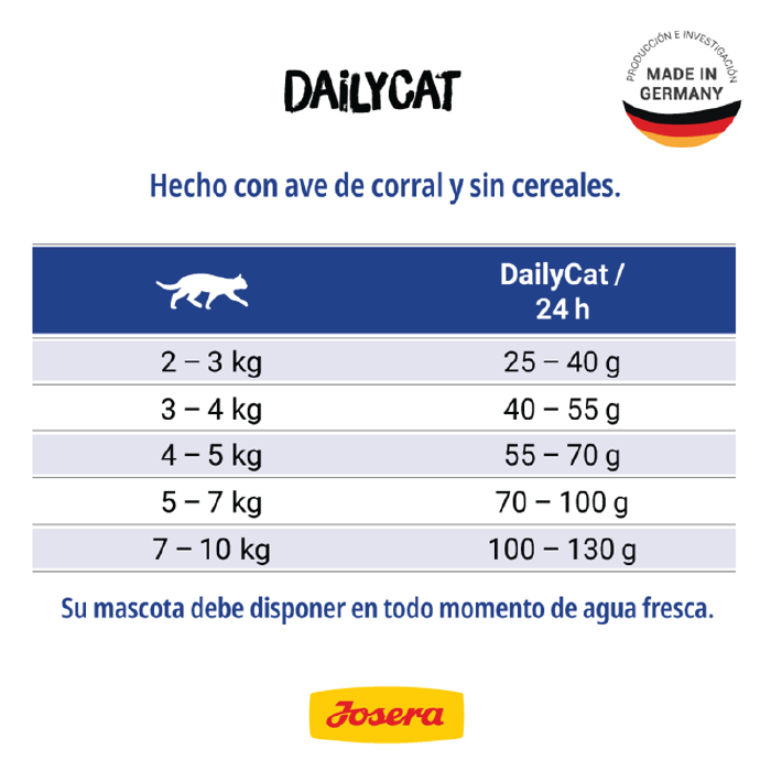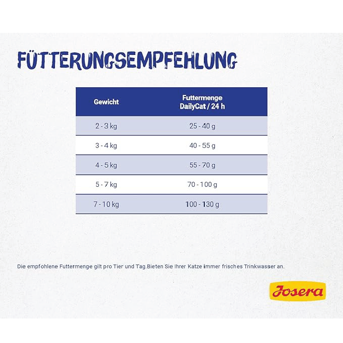 توصیه میشود که برای استفاده از غذای گربه جوسرا دیلی کت طبق داده های زیر و بر اساس وزن گربه عمل کنید و همچنین بهتر است برای حفظ تعادل غذایی در کنار غذای خشک از انواع غذای مرطوب همچون پوچ گربه هم تهیه کنید: