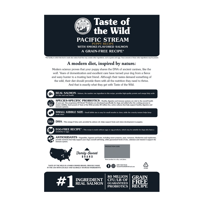 غذای Taste of the Wild Pacific Stream Puppy یعنی یه سفر خوشمزه به دنیای دریاها و جایی که ماهی سالمون، میوههای تازه و پروبیوتیکهای زنده با هم متحد میشن تا تولهسگ کوچولوت باهوشتر، قویتر و خوشحالتر از همیشه باشه .