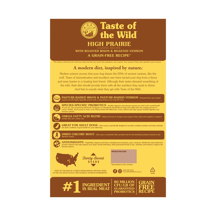 غذای Taste of the Wild High Prairie یه وعدهی واقعی از طبیعته ترکیب پروتئینهای اصیل (گاومیش و گوزن کبابی)، سبزیجات، میوهها و روغن ماهی که اگه بخوای به سگت حس شکارچی بودن، قدرت و درخشندگی بدی، این غذا همون چیزیه که دنبالش بودی .
