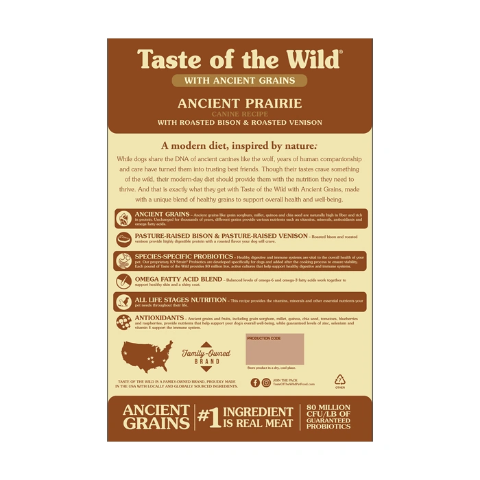 غذای Taste of the Wild Ancient Prairie یعنی ترکیب «تاریخ و طبیعت در هر لقمه» یه جشن از گوشت گاومیش و گوزن باستانی، در کنار غلات کهن مثل کینوا و چیا و غذایی که سگت نهتنها دوستش داره، بلکه بدنش هم ازش ممنون میشه .