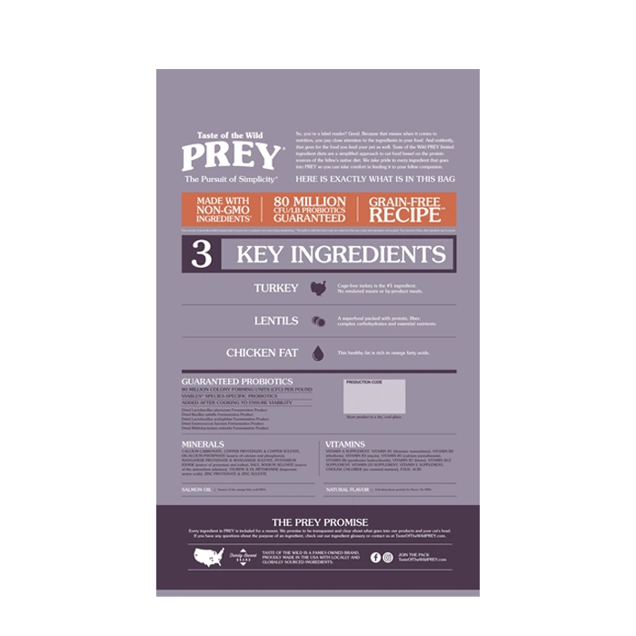 Taste of the Wild Turkey Limited Ingredient یه وعدهی خاص و سادهست، اما پر از عشق، طعم، و سلامت با بوقلمون آزاد و عدس طبیعی، گربهت یه غذای سلطنتی میخوره که بدنش قوی،پوستش براق و دلش شاد میمونه.