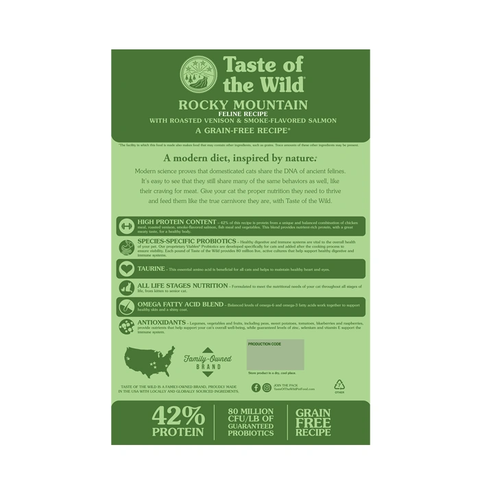 Taste of the Wild Rocky Mountain یه سفر خوشمزه از دل کوه و رودخونه‌ست. ترکیب گوزن کبابی و ماهی سالمون دودی، یه انفجار از طعم، پروتئین و عشق طبیعته با ویتامین‌ها، پروبیوتیک‌های زنده، میوه‌ها و سبزیجات تازه این غذا همه چیزیه که یه گربه‌ی سالم، پرانرژی و خوشحال نیاز داره هر لقمه‌اش مثل قدم زدن گربه‌ت تو دل کوهستانه با بوی ماهی دودی، طعم گوزن کبابی و حس طبیعت واقعی.